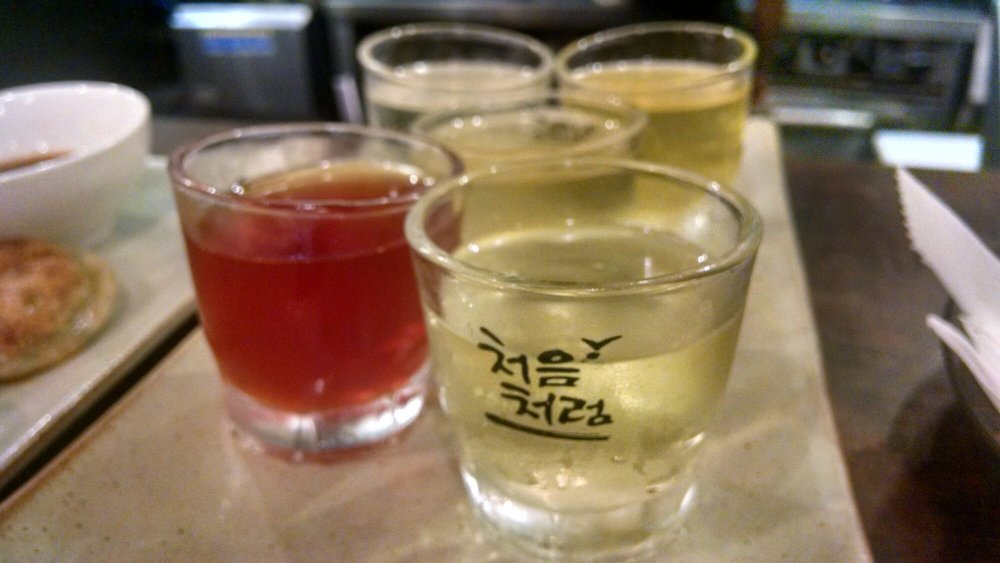 For small plates or as it should be called, anju, we ordered Ho'Cakes, Japchae dumplings, tteokbokki, and spicy Mok wings. Anju is typically accompanied by alcohol so we simply had to have the soju sampler (where each glass come flavored by a different fruit or inspiration)